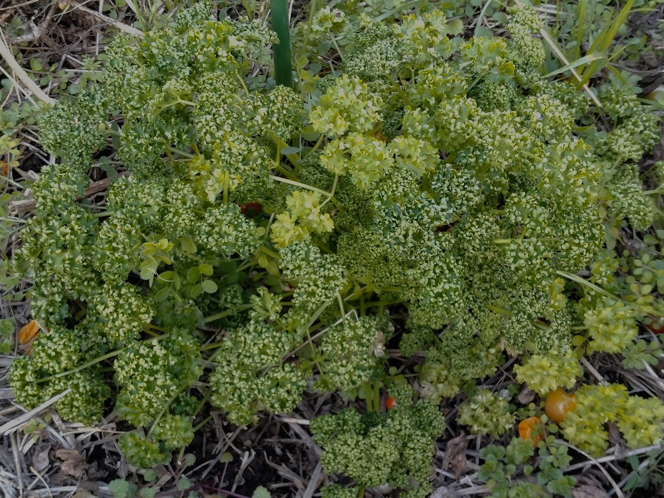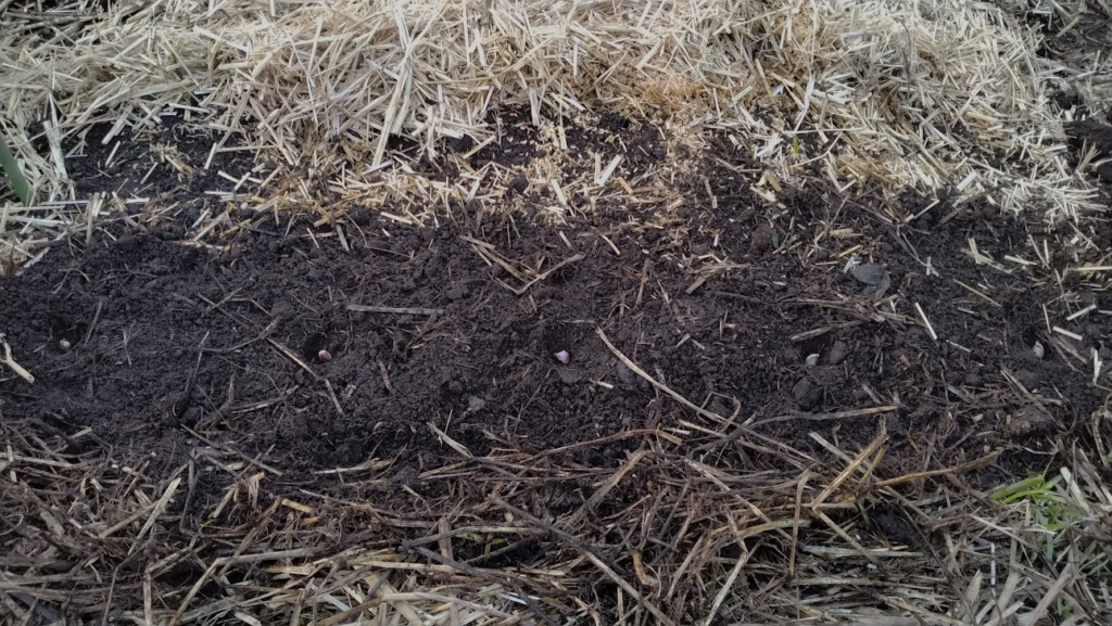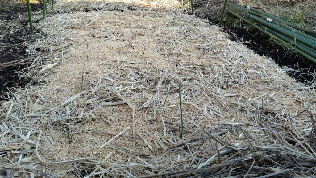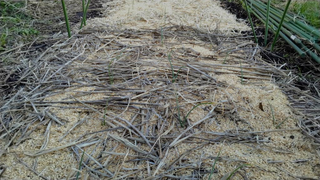 行った序に、僅かに発芽しかかっていた種を5粒追加で定植。定植後は稲わらでマルチング。