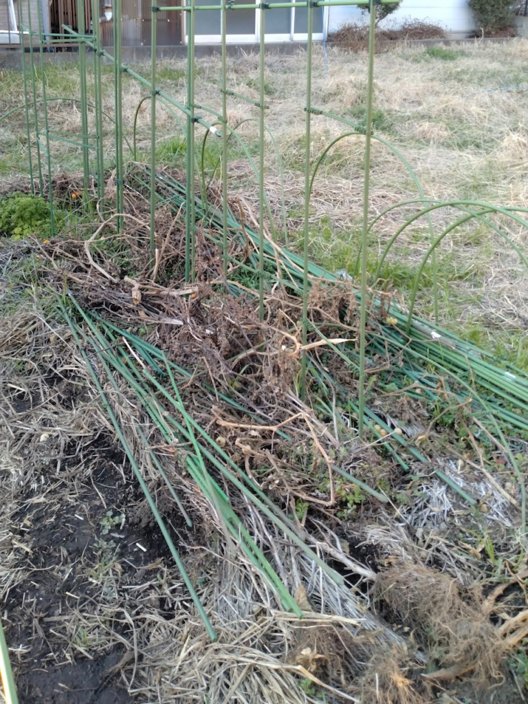 隣のエリアでは、1か月前までミニトマト、バジル他栽培していたのですが、流石にこの季節は殆ど全て枯れ果て、先週末までに全て根こそぎ引き抜きました。ただ、支柱の一部をそのままにしていたので、この日に全て解体。